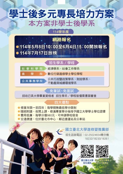 三、檢附本校114學年度學士後多元專長培力方案招生簡章及文宣海報,相關招生資訊請至本校學士後多元專長培力方案網站查詢:https://ntpudpsexam.ntpu.edu.tw/。