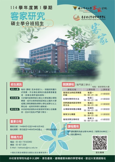五、114學年度第1學期「客家研究碩士學分班」招生簡章,請至本系網頁->最新消息->招生公告->下載http://hakkadepartment.ncu.edu.tw/web/news/news_in.jsp?np_id=NP1751359492388。
