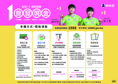 二、為強化民眾消費韌性,擴大內需,提振經濟效益,財政部依因應國際情勢強化經濟社會及民生國安韌性特別條例第3條第11款規定發放現金每人新臺幣1萬元,並採「登記入帳」、「ATM領現」、「郵局領現」、「直接入帳」及「造冊發放」等5種方式,便利民眾領取。