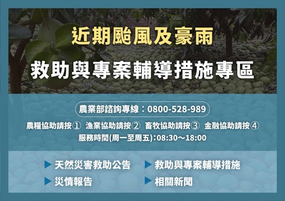 農業部為提供即時且正確之農業天然災害後續重建之金融協助及產業輔導資訊,農業部設置之0800-528-989諮詢專線。