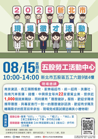 新北市政府就業服務處訂於114年8月15日(五)10時至14時假五股勞工活動中心(新北市五股區五工六路9號4樓)辦理「2025新北市聯合徵才活動」一案,請求職者踴躍參加。