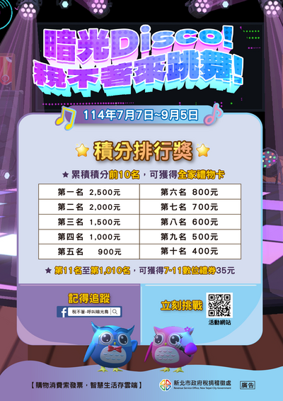 二、活動詳情請上「稅不著—呼叫暗光鳥」粉絲專頁(https://www.facebook.com/ntpctax/)或活動網站(https://ntpc-argame.com/disco/)查詢。