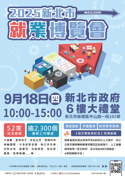 114年9月18日(星期四)假新北市政府6樓大禮堂舉辦「2025新北市就業博覽會」,請求職者踴躍參加。