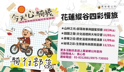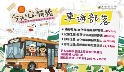 一、為鼓勵民眾親近大自然及感受原鄉風情,花蓮縣萬榮鄉公所規劃騎乘電動輔助自行車及搭乘遊覽車方式,帶領民眾輕鬆體驗來自山林的呼喚與部落族人熱情的款待,以促進部落觀光發展。