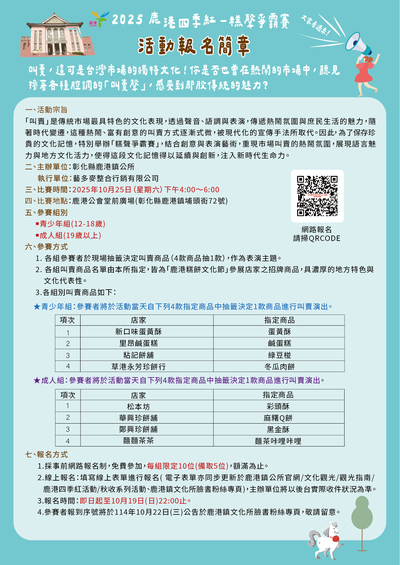 4、參賽者報到序號將於114年10月22日(三)公告於鹿港鎮文化所臉書粉絲專頁,敬請留意。