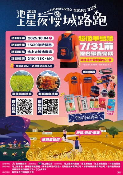 三、本活動詳細資訊請至本所官方網站(https://www.cs.gov.tw/home/)或本活動FB粉絲專頁(FB搜尋:池上星夜慢城路跑)查詢並以網站公告最新資訊為主。