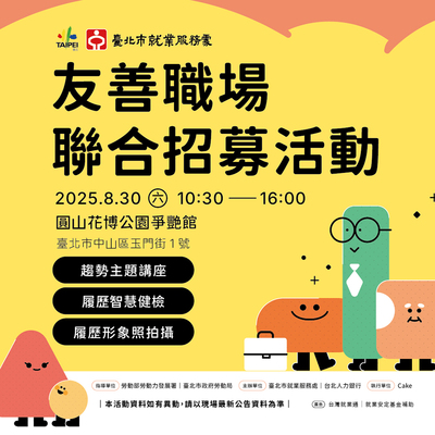 臺北市就業服務處114年8月30日「友善職場聯合招募活動」宣傳文稿及圖檔1份,請查照。