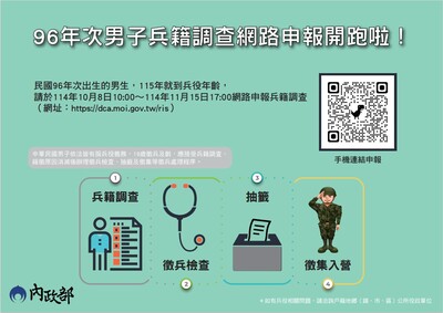 三、96年次男子明年屆徵兵及齡,於今(114)年10月8日上午10時至11月15日下午5時,由內政部役政司網站首頁/主題單元/點選連結進入「兵籍調查線上申報」作業系統(網址:https://dca.moi.gov.tw/ris),登錄兵籍表所需之個人資料後即可完成兵籍調查作業。